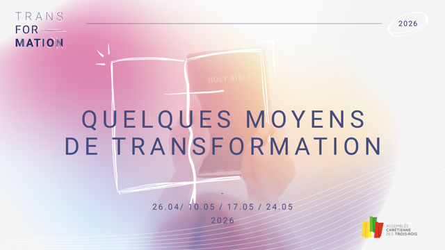 Dimanche 3 mai 2026, à la Bessonne (week-end d'église) 10h-11h45: Culte & Message biblique sur le thème de la transformation Orateur : Jean-Philippe Fréchette Activités pour les enfants.