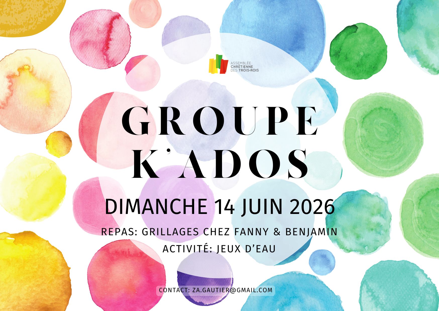 Dimanche 14 juin 2026 Groupe K'Ados Repas: Grillade chez Fanny & Benjamin Activité: Jeux d'eau Activité & Partage pour les 11-15 ans Responsables: Benjamin & Fanny Koffler, Nicolas & […]