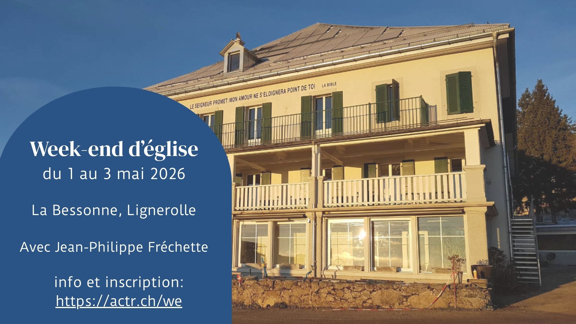 Weekend d'église Du vendredi 1 mai dimanche 3 mai 2026, en pension complète à la Bessonne, Lignerolle. Orateur : Jean-Philippe Fréchette Plus d'informations ici : Weekend | ACTR