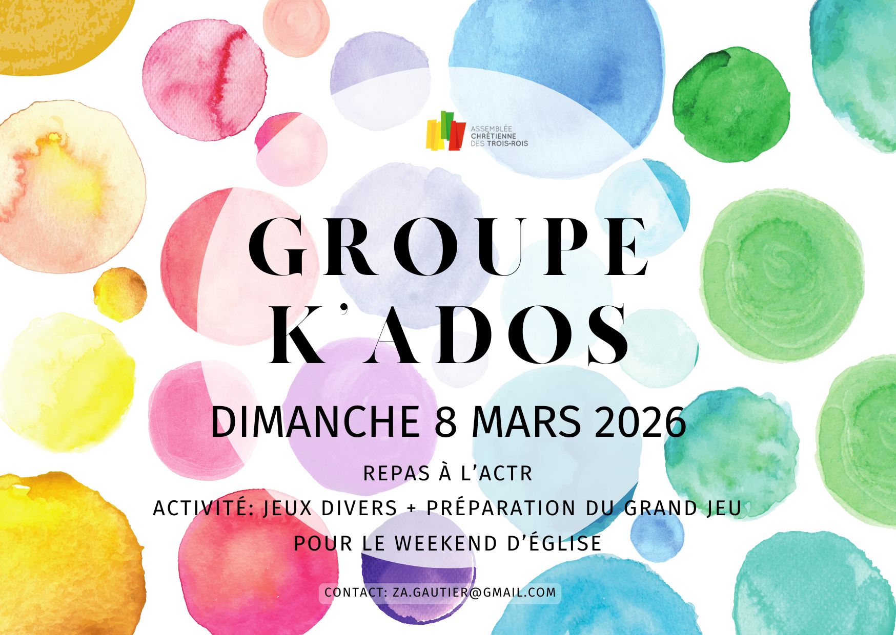 Dimanche 8 mars 2026 Groupe K'Ados Repas à l'ACTR Activité: Jeux divers + préparation du grand jeu pour le weekend d'église Activité & Partage pour les 11-15 ans Responsables: […]